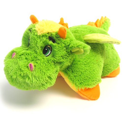 This jolly green dragon has a yellow belly, spiky tail and wings that flap. Watch out for his fiery breath!Starts out as your favorite pal, but release the velcro tab on its tummy and before you can say "snuggle", it transforms into the coziest pillow in your house. These multi-functional stuffed animals are a favorite for all ages, from toddlers to teens. Great for play time or nap time, Pillow Pets are super-soft chenille plush animals so adorably lovable and squeezably huggable you'll never want to put them down! Read more...